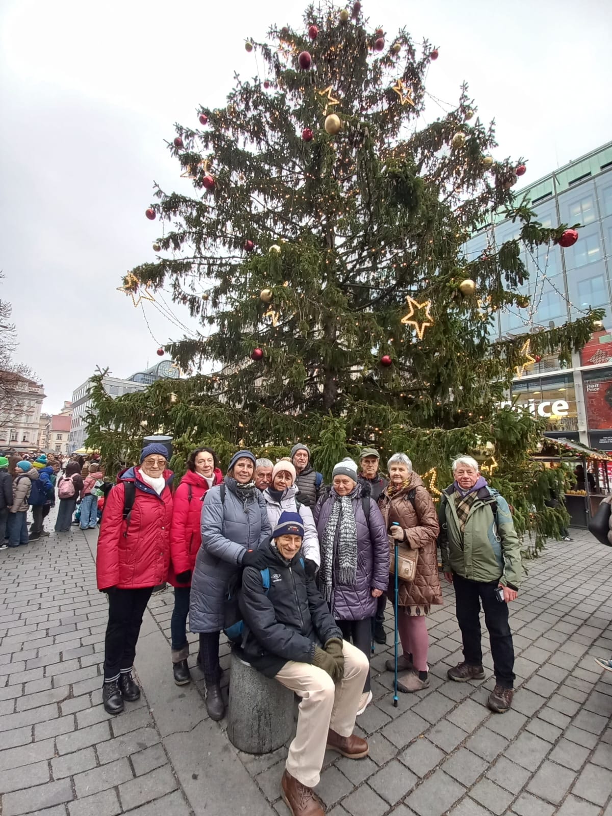 Ve středu 17.12.2025 jsme odjeli nasát trochu té vánoční atmosféry, takže kde jinde, než v naší oblíbené, stověžaté matičce Praze. Cesta tam začala z finančních důvodů změnou dopravce, pokračovala již obvyklou návštěvou jídelny Světozor, na kterou navazoval přesun centrem s předvánoční výzdobou a kontrolou cenové úrovně u stánků, kde byla nastavena téměř jednotná laťka. Hlavní cíl byl zajištěn paní průvodkyní, která nás ,,některé již mírně nahluchlé:)'', mile překvapila svou zvukovou aparaturou, kterou již uvnitř chrámu, kde nebylo dovoleno fotografování, nepoužívala. Vnitřní fota jsme nahradili výběrem z 557 snímků, které jsou na "mapách.cz" připojeny k heslu Týnský chrám. Celkem bylo 15 účastníků, překonaná vzdálenost se blížila pěti kilometrům při obvyklé zimně zatažené obloze a sychravé teplotě kolem tří stupňů Celsia.